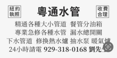 ![]() | 纽约真诚通管!9176602605 纽约执照 收费合理 快速疏通 住家 餐馆 大型商铺各种排水管道 日夜急修 超声波测漏水 抽水泵 热水炉 餐馆分油箱 来水总开关来水管漏水 9176602605 黄先 By 匿名 on | ❄️冷暖水电水管系统 | By 匿名 on |