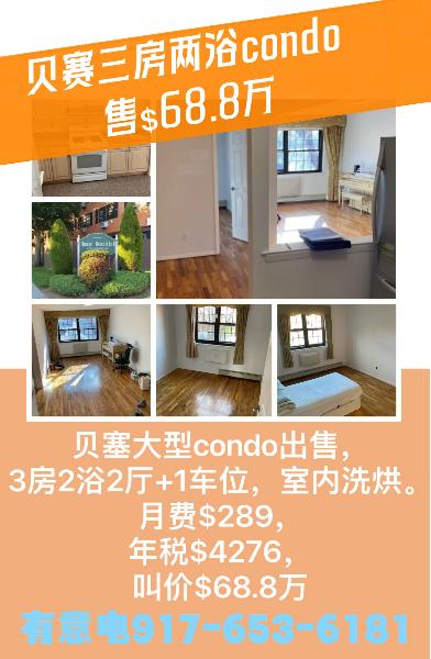 贝塞大型condo出售,3房2浴2厅+1车位,室内洗烘。月费$289,年税$4276,叫4