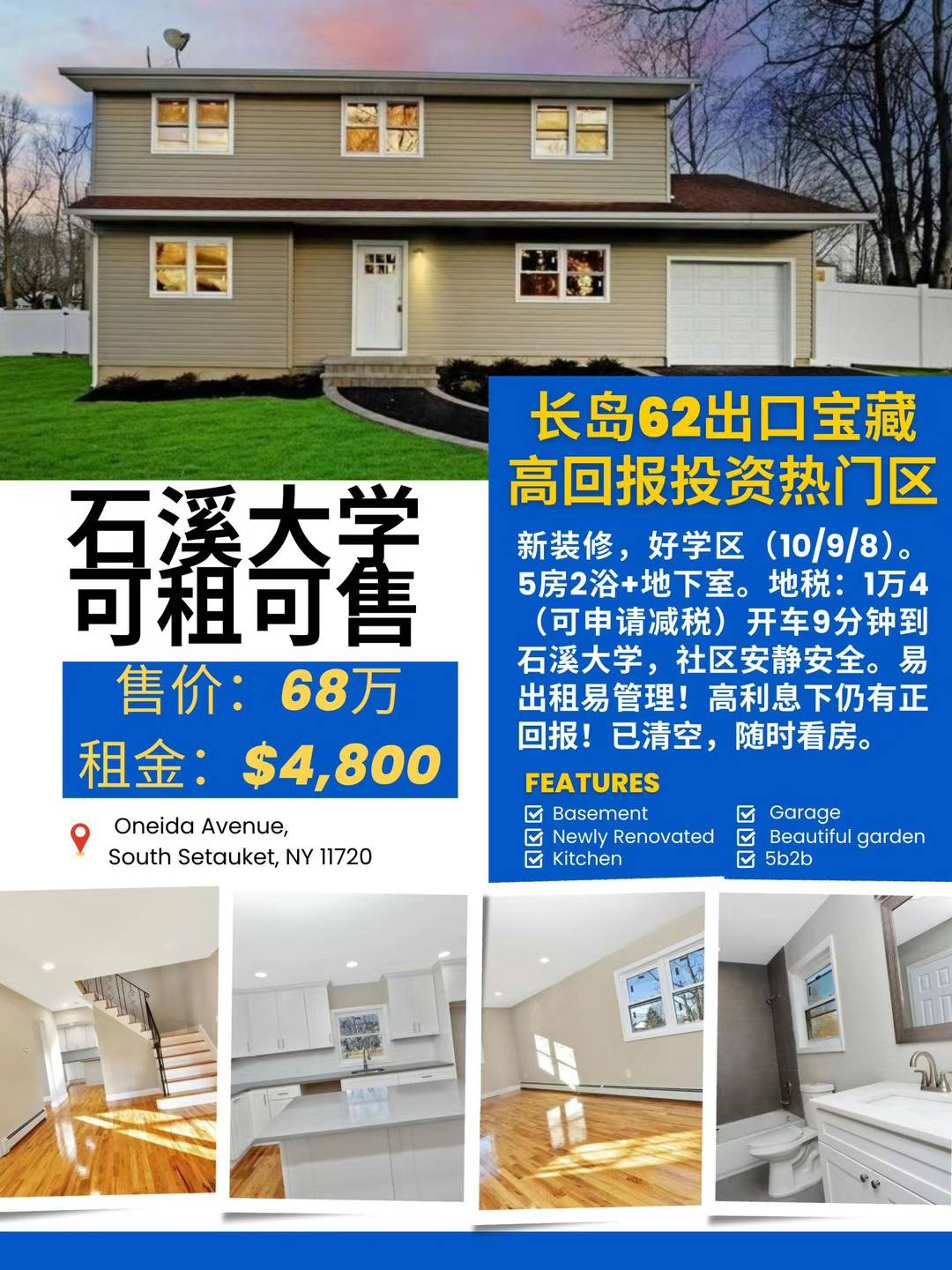 ㊙️长岛62出口石溪大学宝藏高回报投资热门区房产出租出售㊙️