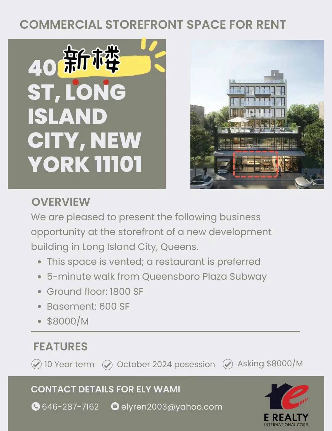 纽约商铺出租💕2024 年10月新楼, LIC 长岛市 一楼餐馆Vented 招租1800 尺+ Basement600 尺,$8000/月N, W, 7 车 Queens Boro Plaza 地铁步行5分钟