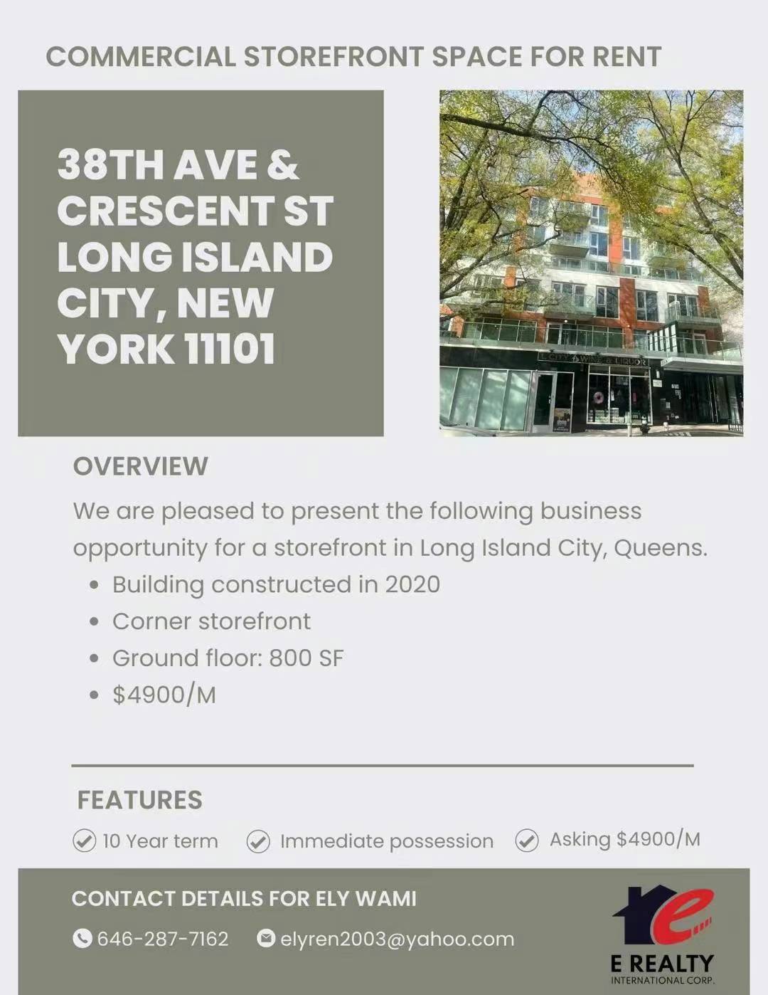 💕2020年新楼 LIC长岛市街角店铺招租 800尺$4900/月, 适合各行各业。
