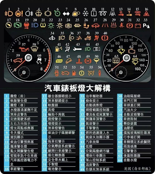 3. 灯号一亮别太过惊慌,车子不会爆炸或半路熄火。先看下文介绍大概知道各灯号代表的意思,再依照个别情况来处理。