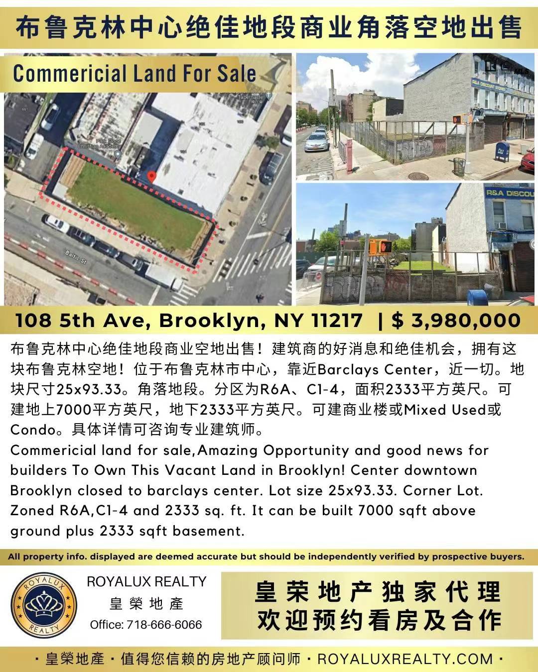 纽约商业地产出售:👑布鲁克林中心绝佳地段商业角落空地出售!