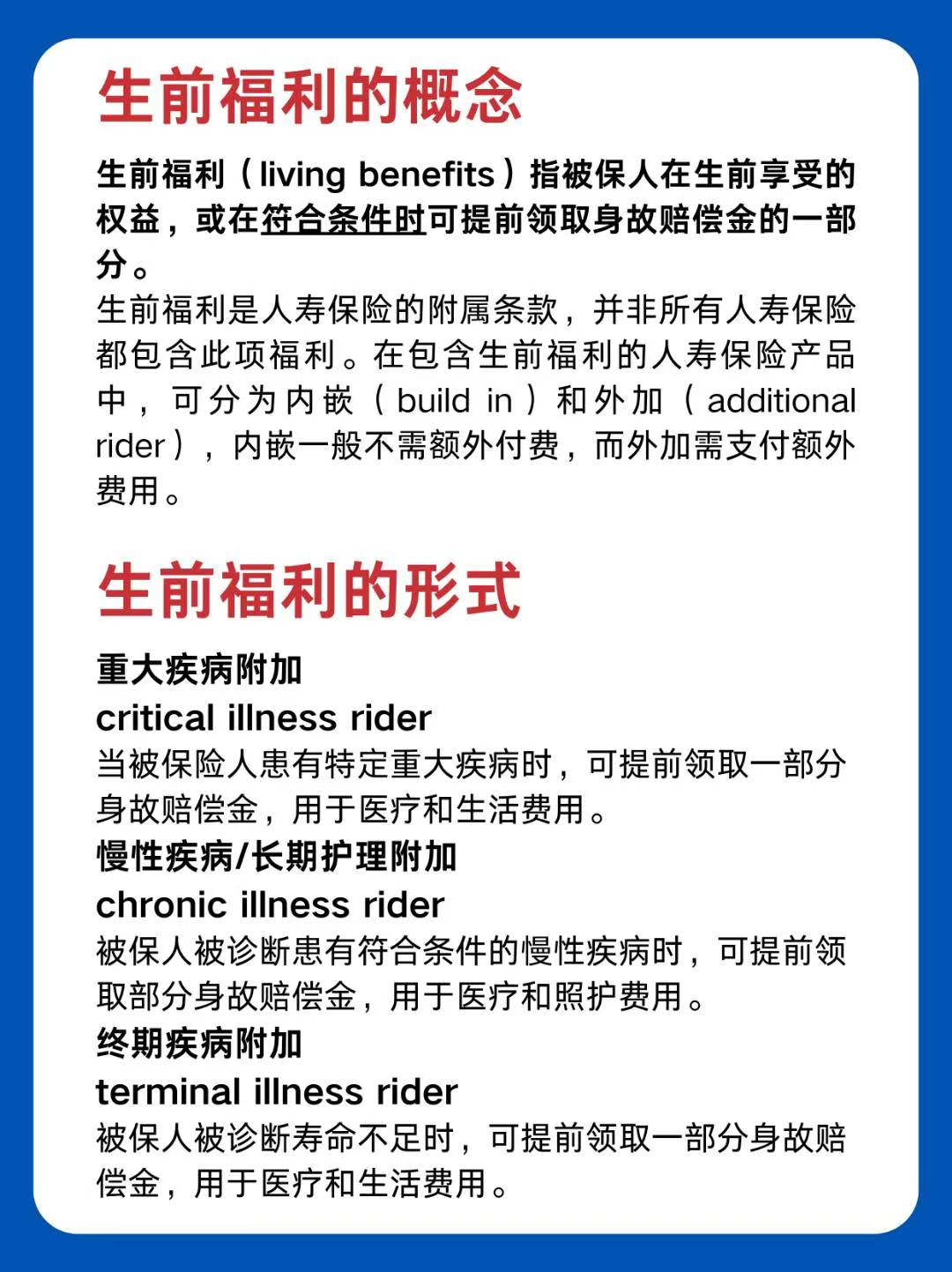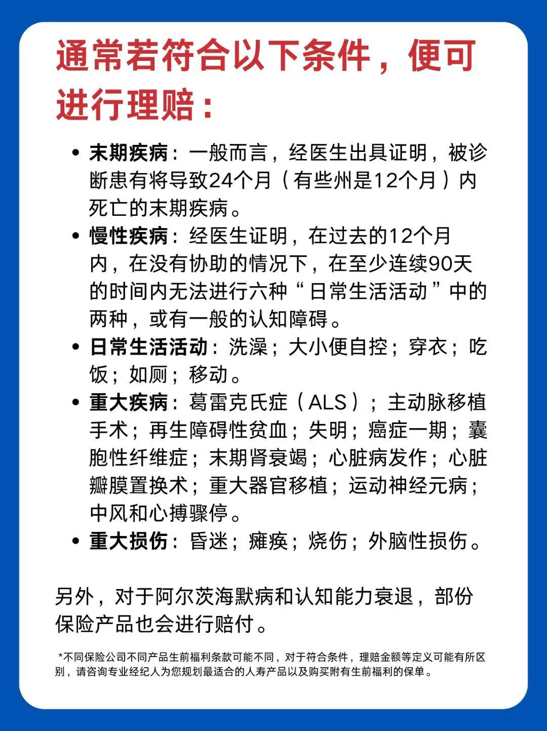 💡 美國的人寿保险不仅在意外降临时提供保障,更有Living Benefits生前福利。只要符合约定条件,投保人活着时就能提取死亡赔偿金,实现更灵活的保障使用。让我们珍惜每个当下,从现在开始为健康负责!