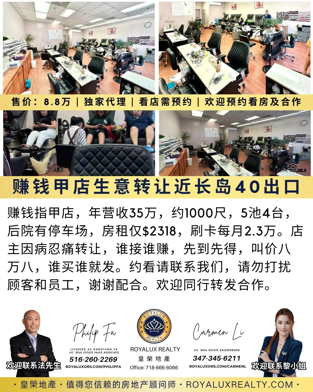 🌺🌺赚钱生意转让甲店近长岛40出口,年营收35万,约1000尺,5池4台,后院有停车场🌺房租仅$2318🌺刷卡每月2.3万、店主因病忍痛转让🙏谁接谁赚😁😁👍👍先到先得🙏🙏叫价八万八,谁买谁就发😄🙏🙏欢迎同行转发合作☎️5162602269 Philip Fa