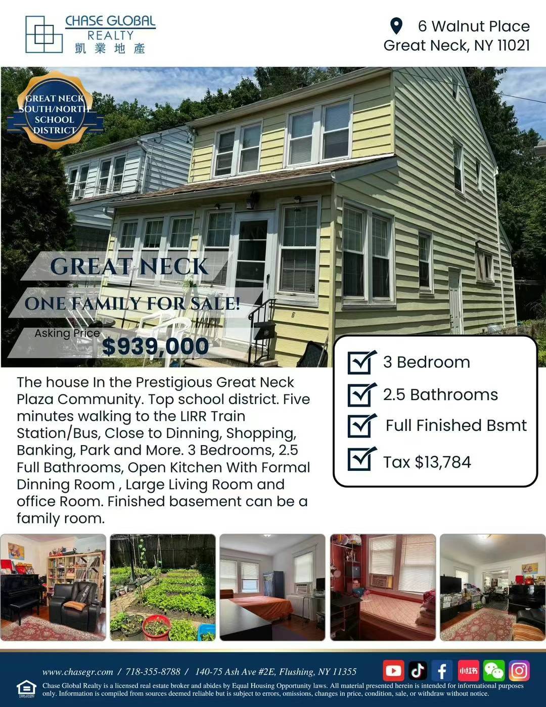 【Great Neck 学区房 仅售93万9】 秒卖好房源,好学区排名在全美国前10,纽约州前三名,南校北校可选