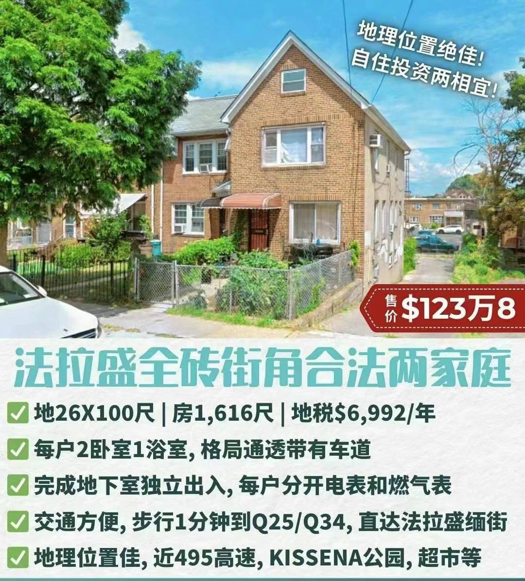 ❤️法拉盛房屋出售今天下午4:30PM可看☎️需预约✨法拉盛全砖街角合法两家庭 ✨