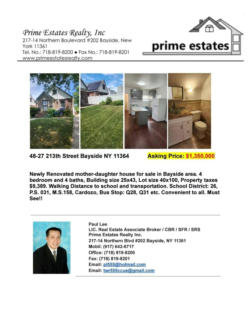 貝賽獨立母女屋出售、4臥4浴、屋面積 25x43、地大40x100、地稅 $9,389、26學區、小學31、初中158、高中 Cardozo、全新裝修、現有租客、可交空、每月收租 7千多、售價 $135萬、歡迎合作