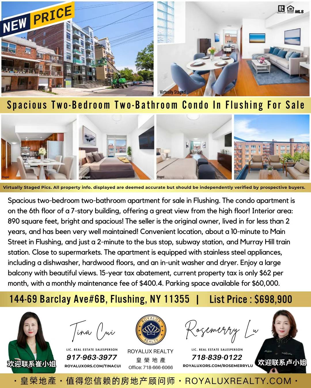 公寓共7层,本单位位于6层,高楼层视野好!室内面积:890尺,宽敞明亮!卖家是第一任屋主,仅居住了不到2年,保养非常好!位置便利,距离法拉盛缅街约10分钟,距离公共汽车站、地铁站和Murray Hill火车站约2分钟路程。生活机能强大,靠近超市。屋内配有不锈钢电器,包括洗碗机,硬木地板和室内洗衣机和烘干机。享受拥有美景的大阳台。15年减税,现地税仅$62/月,管理费$400.4/月。车库$6万。欢迎同行转发合作和预约看房!