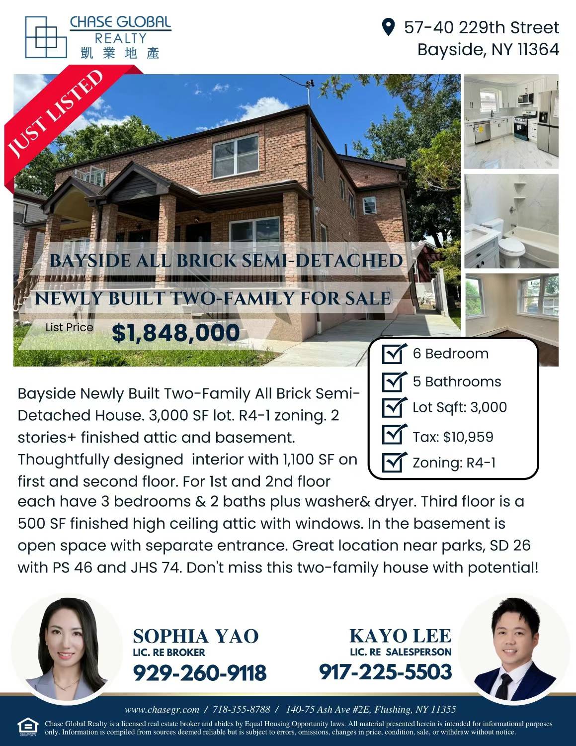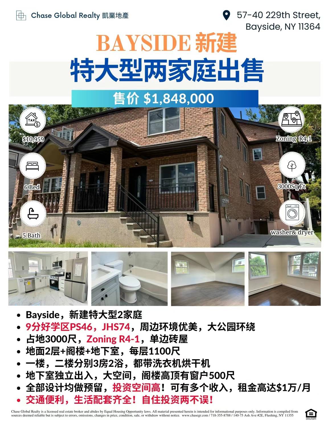 贝赛Bayside 新建 特大型2家庭,9分好学区PS46, JHS74。贝赛周边环境优美,大公园环绕。贝赛房子出售Bayside NY