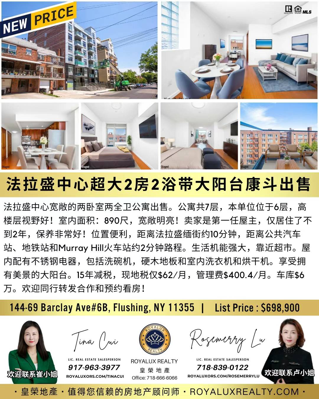 公寓共7层,本单位位于6层,高楼层视野好!室内面积:890尺,宽敞明亮!卖家是第一任屋主,仅居住了不到2年,保养非常好!位置便利,距离法拉盛缅街约10分钟,距离公共汽车站、地铁站和Murray Hill火车站约2分钟路程。生活机能强大,靠近超市。屋内配有不锈钢电器,包括洗碗机,硬木地板和室内洗衣机和烘干机。享受拥有美景的大阳台。15年减税,现地税仅$62/月,管理费$400.4/月。车库$6万。欢迎同行转发合作和预约看房!