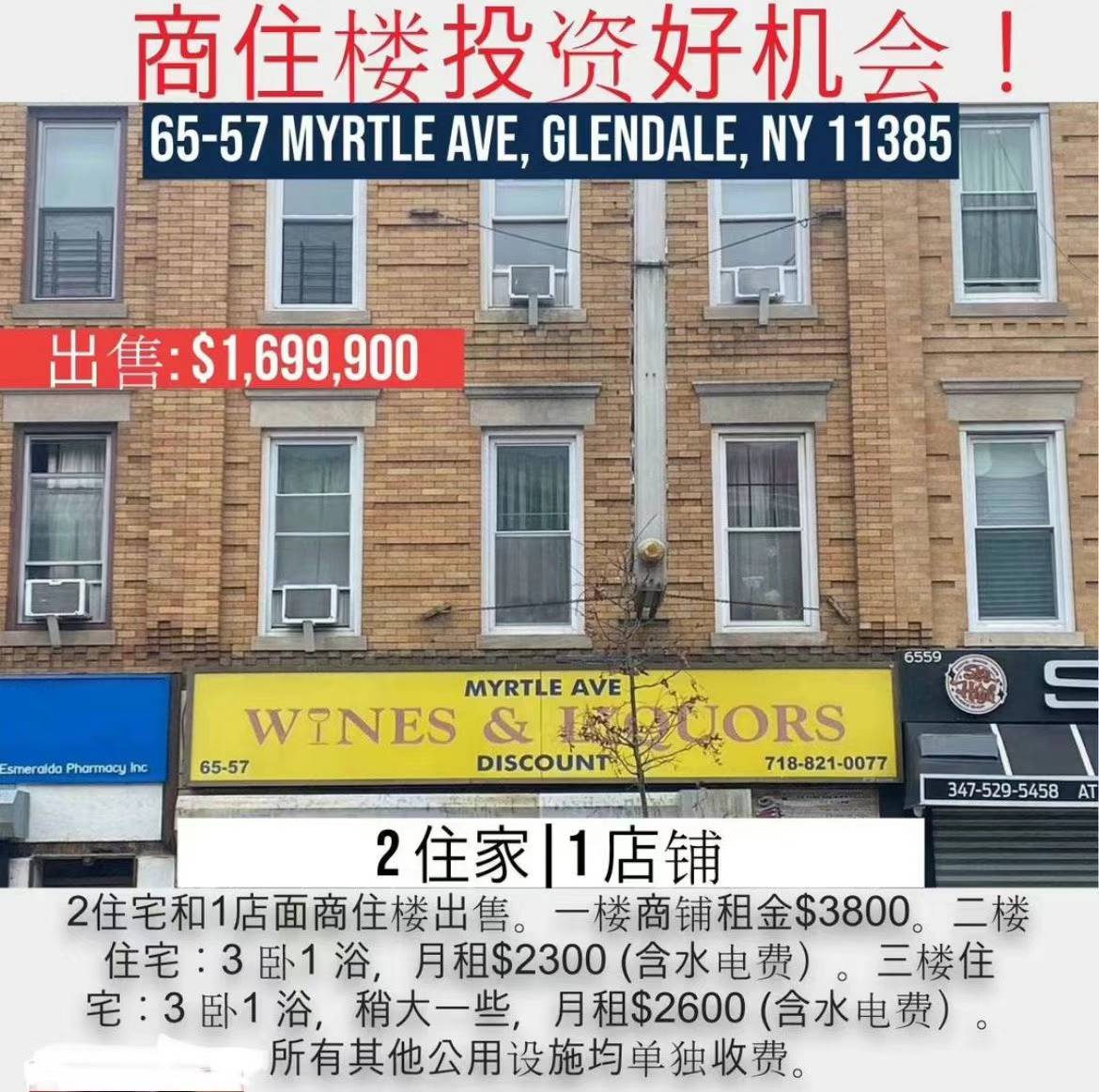 纽约商业地产出售商住楼2住宅和1店面商住楼出售。一楼商铺租金$3800。二楼住宅:3 卧1 浴,月租$2300 (含水电费)。三楼住宅:3 卧1 浴,稍大一些,月租$2600 (含水电费)。所有其他公用设施均单独收费。