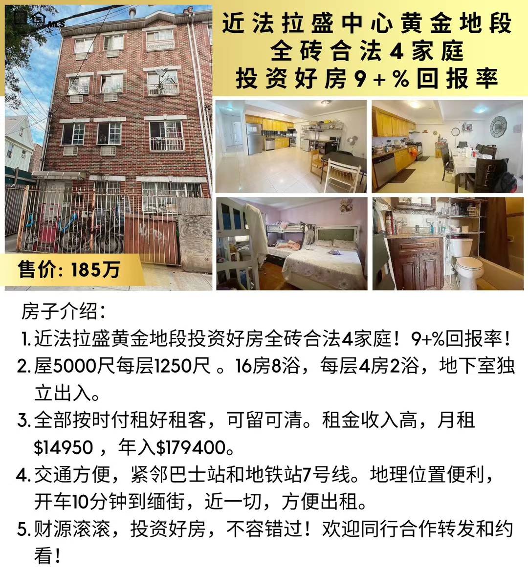 皇后区房屋出售买卖黄金地段全砖合法4家庭9+%回报率