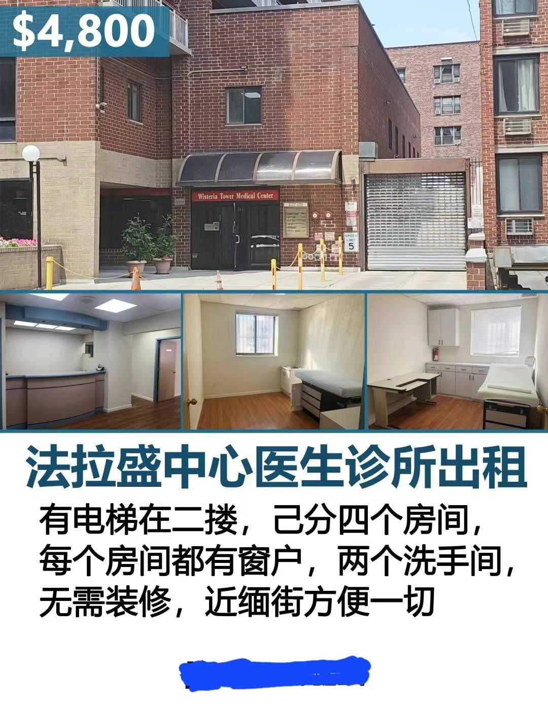 【办公室出租】法拉盛中心136-Maple ave医生诊所出租,有电梯在二搂,己分四个房间,每个房间都有𥦬户,两个洗手间,无需装修,近缅街方便一切,仅租$4800 646 239 4836