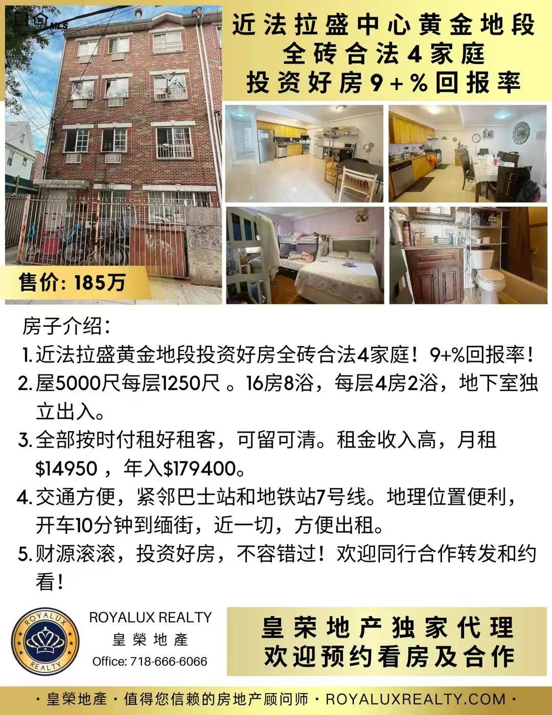 法拉盛黄金地段全砖合法4家庭9+%回报率 仅售 💰 $185万