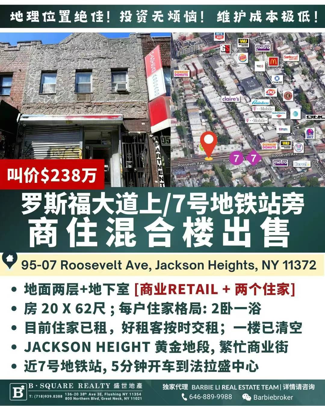 纽约商业地产出售 新上市📢商业买家看过来!👋现惊喜价‼️还有兴趣的买家私信我‼️🤩整条街破纪录最低价‼️✅地面两层+地下室 [一楼商业retail + 二楼两个住家]✅房 20 x 62尺 ; 住家格局: 前后座2卧1浴✅目前住家已租,好租客按时交租,一楼店面已清空✅Jackson Heights 黄金地段, 繁忙商业街🚍近7号地铁站, 5分钟开车到法拉盛中心📍95-07 Roosevelt Ave, Jackson Heights, NY 11372独家代理 欢迎合作 646-889-9988