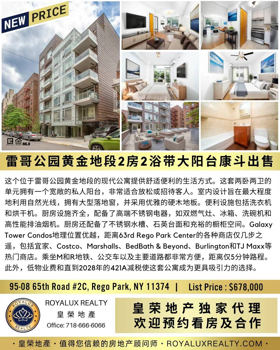 Rego Park雷哥公园房子出售Rego Park NY新上市【价格调整】雷哥公园房屋出售独家代理康斗出售👑雷哥公园黄金地段2房2浴带大阳台康斗出售| 售价:67.8万‼️