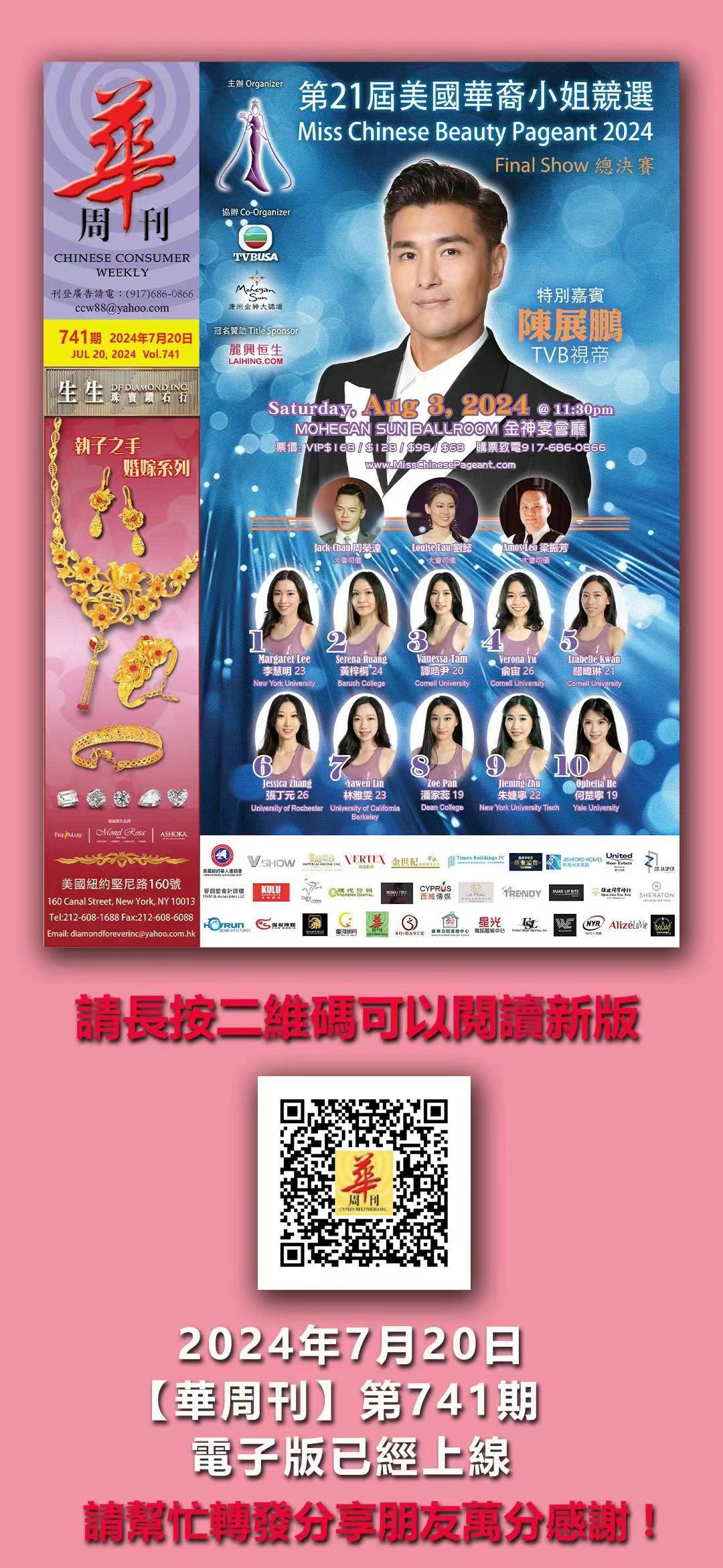 《2024 美國華裔小姐競選》終決賽將會於8月3日星期六晚上11時半在康州金神大賭場宴會廳舉辦,2024 美國華裔小姐競選 想看佳麗們們如何在舞台上展現她們的自信與魅力及才華,還有一睹特別嘉賓TVB視帝陳展鵬的演出立刻聯繫917-686-0866購買門票VIP$168、$128、$98&$68,選美會官方網站www.MissChinesePageant.com查詢。
