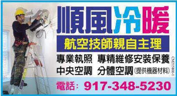 纽约顺风冷暖空调公司航空技师亲自主理 专业执照解决一切疑难杂症