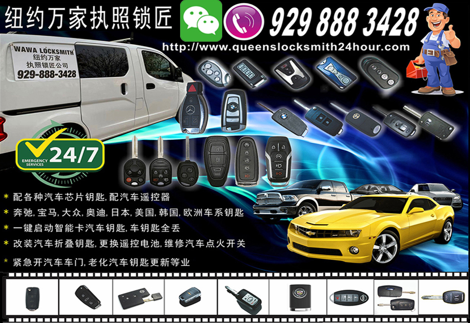 纽约配汽车芯片钥匙汽车智能遥控钥匙929-888-3428 纽约法拉盛万家锁匠上门开锁修锁换锁纽约开锁,万家锁匠电话:9298883428,修换装锁,配汽车钥匙