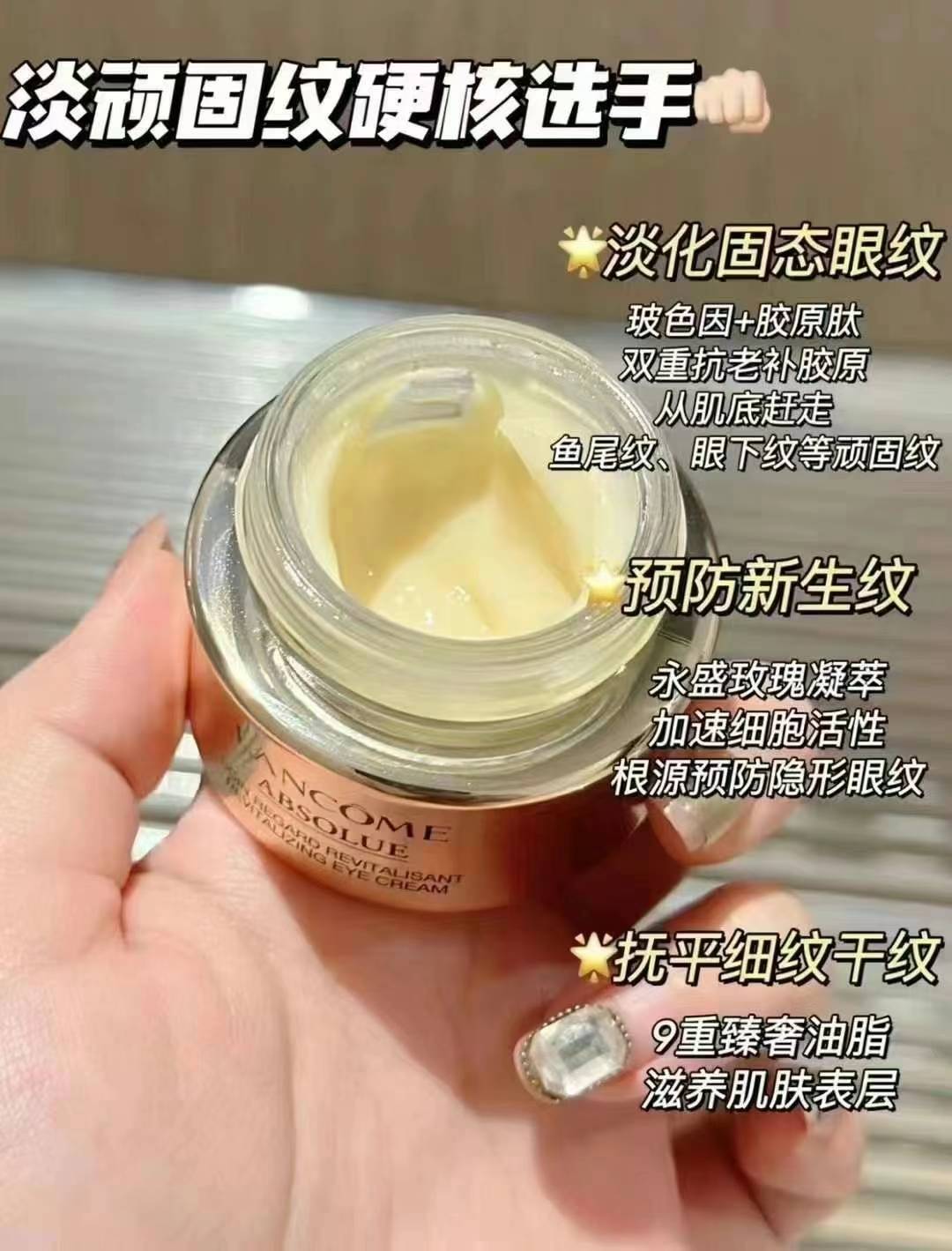 兰蔻菁纯眼霜主打8%浓度玻色因+50倍高浓玫瑰精粹温润复配,兼顾眼周表层滋润和深层抗皱,如此相辅相成,所以干纹才能快速解决,皱纹也能在短时间快速改善。