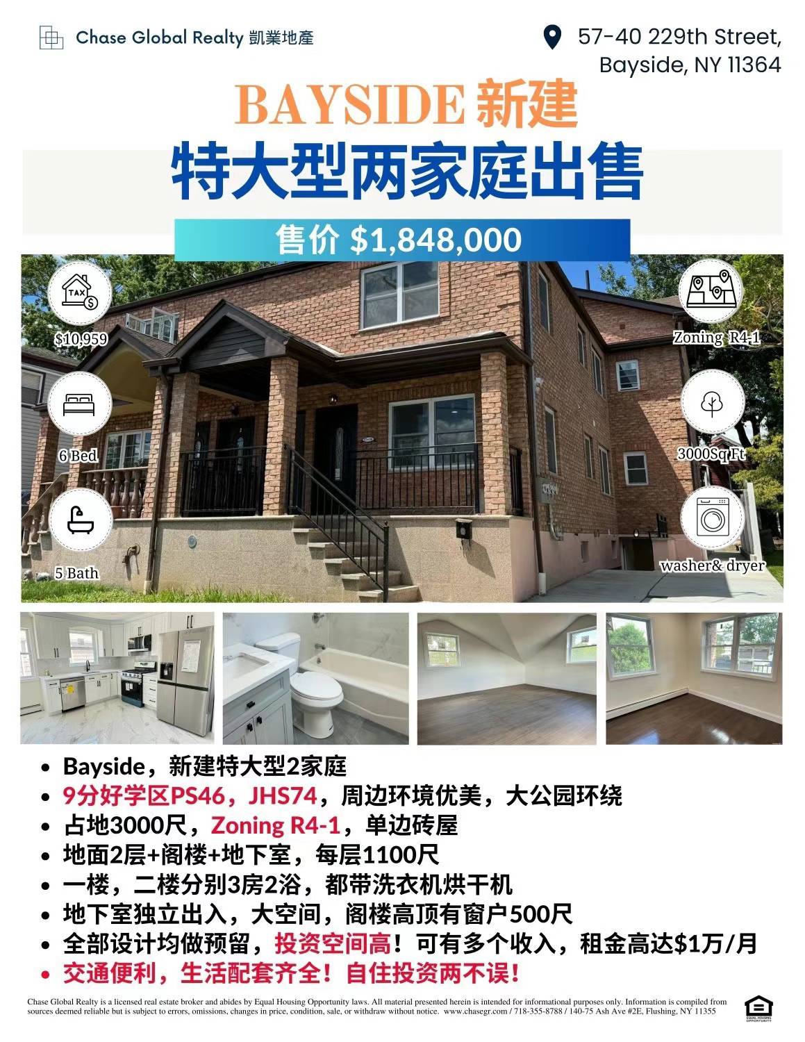 Bayside贝赛房子出售Bayside NY新上市 周末看 贝赛房子出售 新上市Bayside 贝赛2家庭房源Bayside贝赛 新建 特大型2家庭,9分好学区PS46, JHS74。周边环境优美,大公园环绕。地30X100,Zoning R4-1,单边,砖屋地面2层+阁楼+地下室