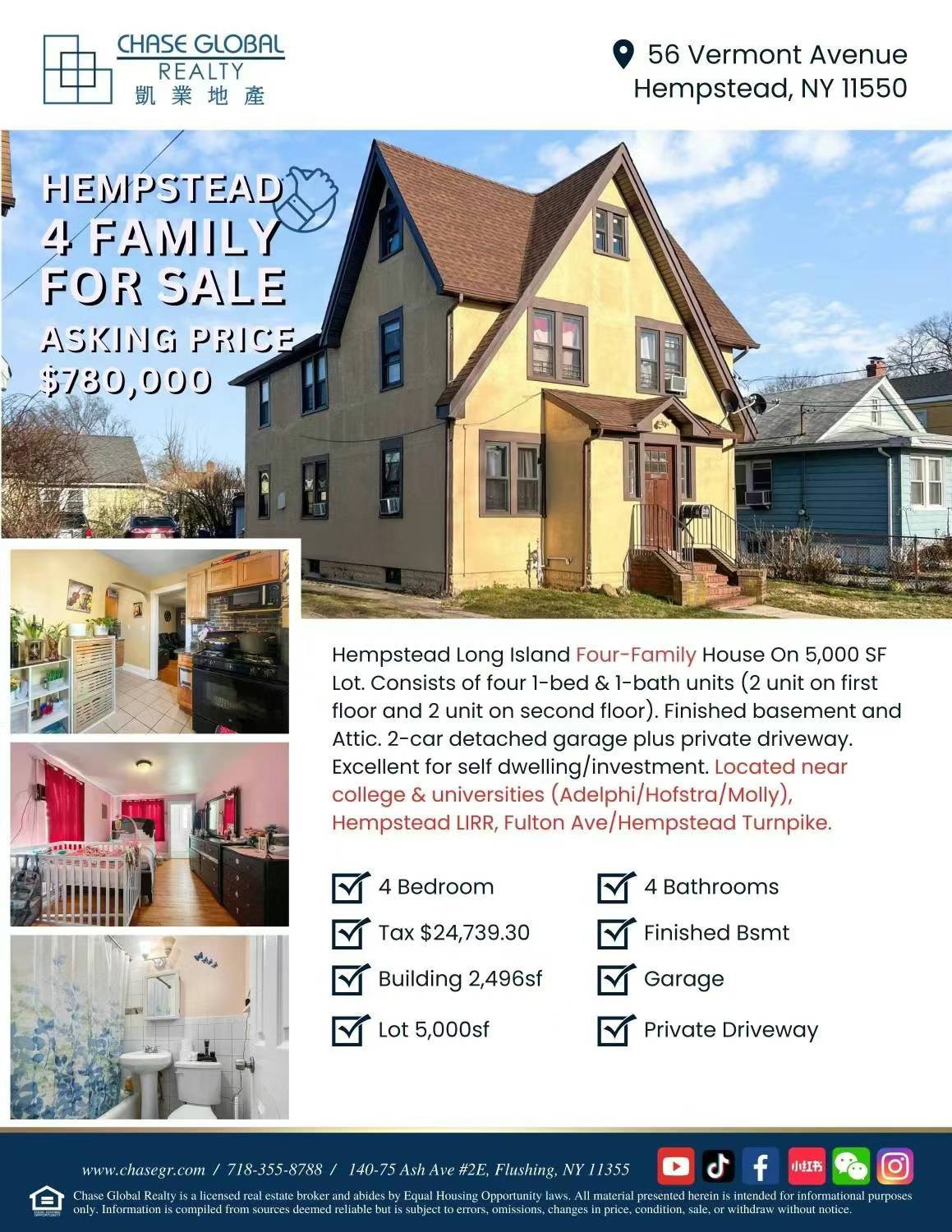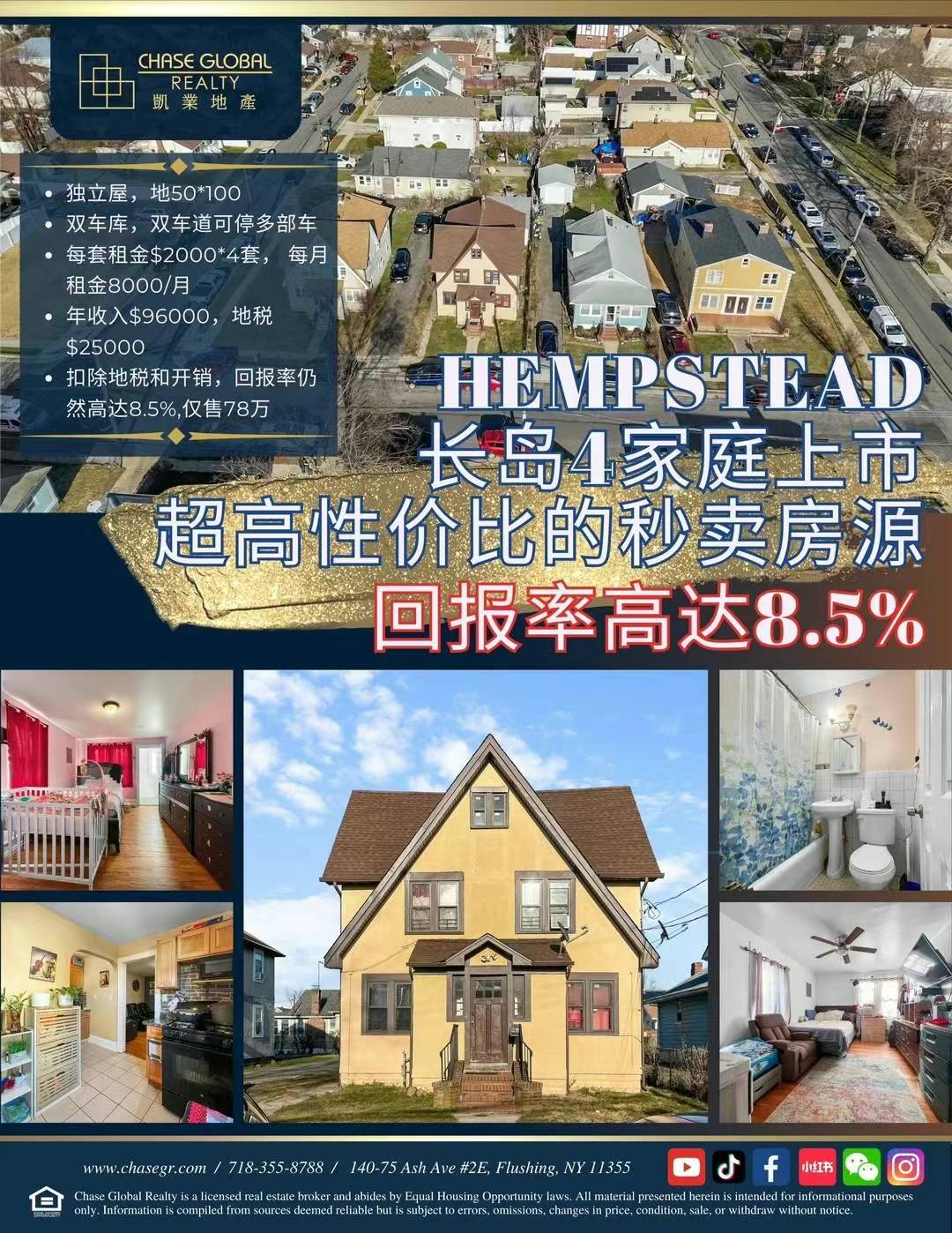Long Island Garden City长岛花园城房子出售Long Island NY新上市爆款房源,长岛花园城出售群众眼光好犀利!独家代理长岛花园城出售超高性价比的秒卖房源,回报率高达8.5%。位于Garden City南部Hempstead镇。长岛4家庭出售,仅售78万。