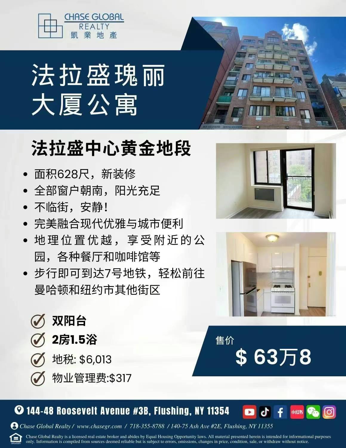 Flushing法拉盛康斗出售Flushing NY Luxury Condo for sale新上市 Flushing法拉盛新楼盘出售Flushing New Construction新上市 周末看,独家代理 【法拉盛康斗出售63万8】步行mianst缅街,新装修,在3楼,2房1.5浴