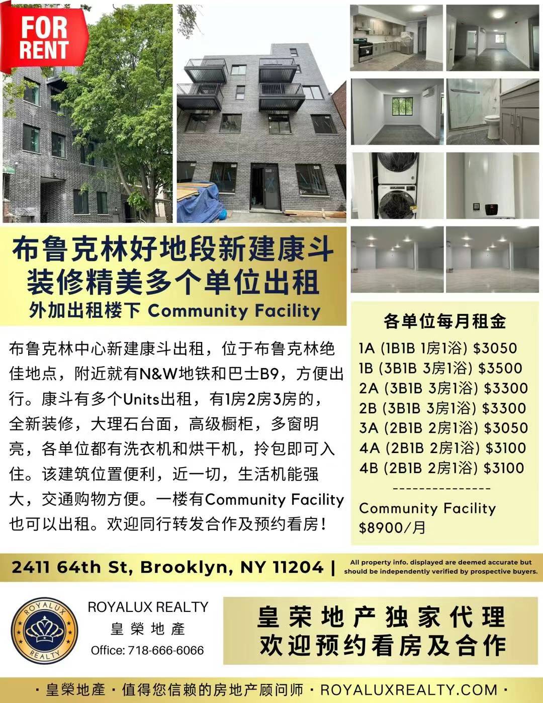 布鲁克林中心新建康斗出租,位于布鲁克林绝佳地点,附近就有N&W地铁和巴士B9,方便出行。康斗有多个Units出租,有1房2房3房的,全新装修,大理石台面,高级橱柜,多窗明亮,各单位都有洗衣机和烘干机,拎包即可入住。该建筑位置便利,近一切,生活机能强大,交通购物方便。一楼有Community Facility也可以出租。欢迎预约看房!917 660 5298
