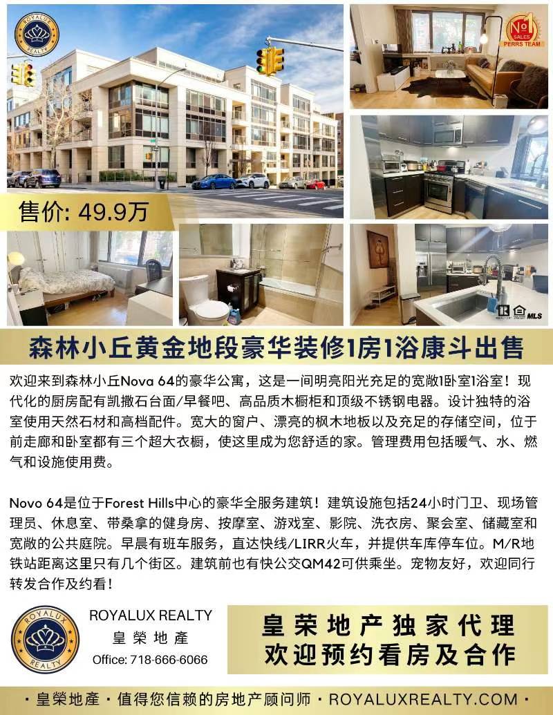 Forest Hills森林小丘房子出售Forest Hills NY新上市👑皇地荣产即上将市独家理代好房源👑森小林丘黄金地豪段华装修1房1浴斗康出售 | 售价49.9万