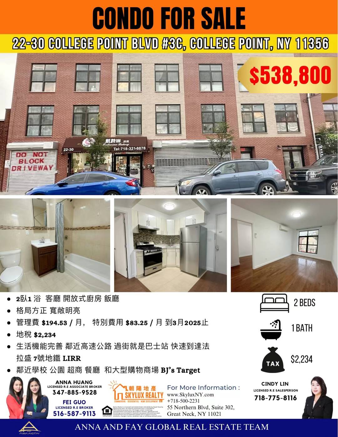 College Point大学点房子出售 College Point NY 🆕新上市🌺🌷College Point 康斗出售☀️2臥1 浴 客廳 開放式廚房 飯廳☀️格局方正 寬敞明亮