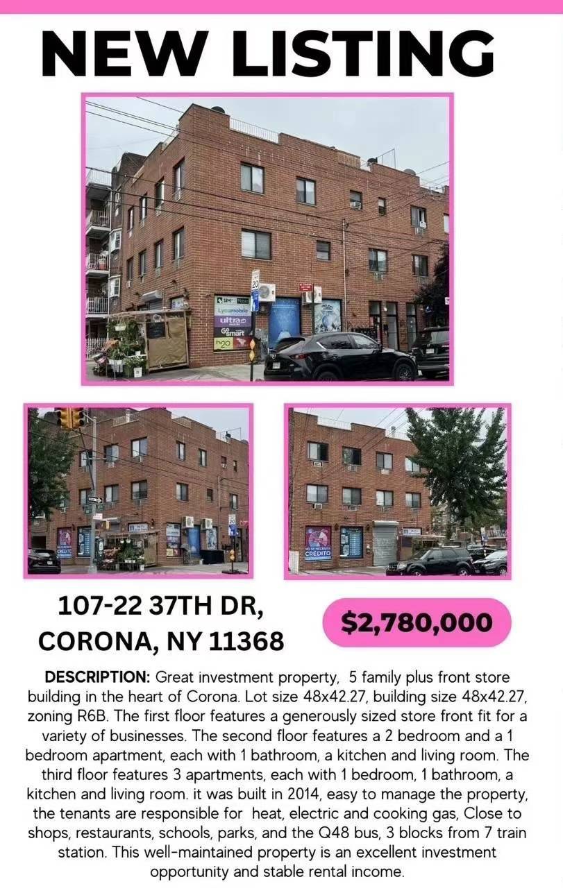 Corona可乐娜房子出售Corona NY新上市🎉新上市🎉佳业地产代理Corona 一个店面 +5家庭热闹地段,使用面积6087尺开价$278万 973 220 4324