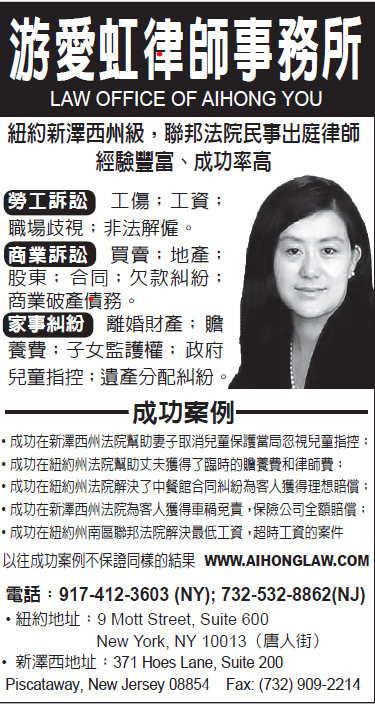 游爱虹律师事务所专注于为客户提供劳务诉讼、商业诉讼、家事纠纷、遗嘱和信托、地产等方面的法律援助。游律师持有纽约州执照, 新泽西州执照, 各级联邦法院, 破产法院执照。为大纽约地区客户提供一站式法律帮助。多年来,游律师成功地帮助无数客户解决了各种法律难题 。 无论是个人还是企业,都对游爱虹律师事务所提供的辩护服务非常满意。