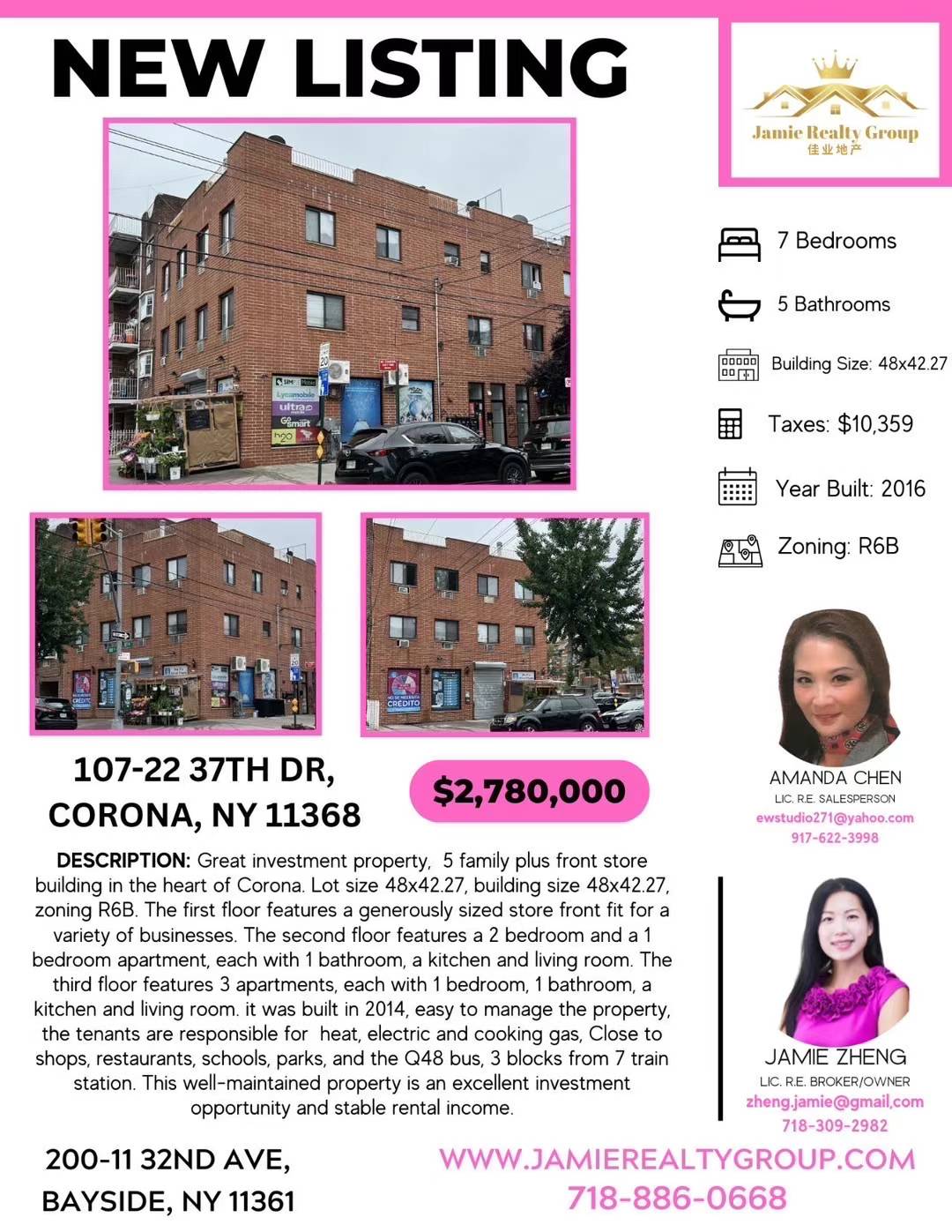 Corona可乐娜房子出售Corona NY新上市🎉新上市🎉佳业地产代理Corona 一个店面 +5家庭热闹地段,使用面积6087尺 开价$278万Amanda Chen 917-622-3998