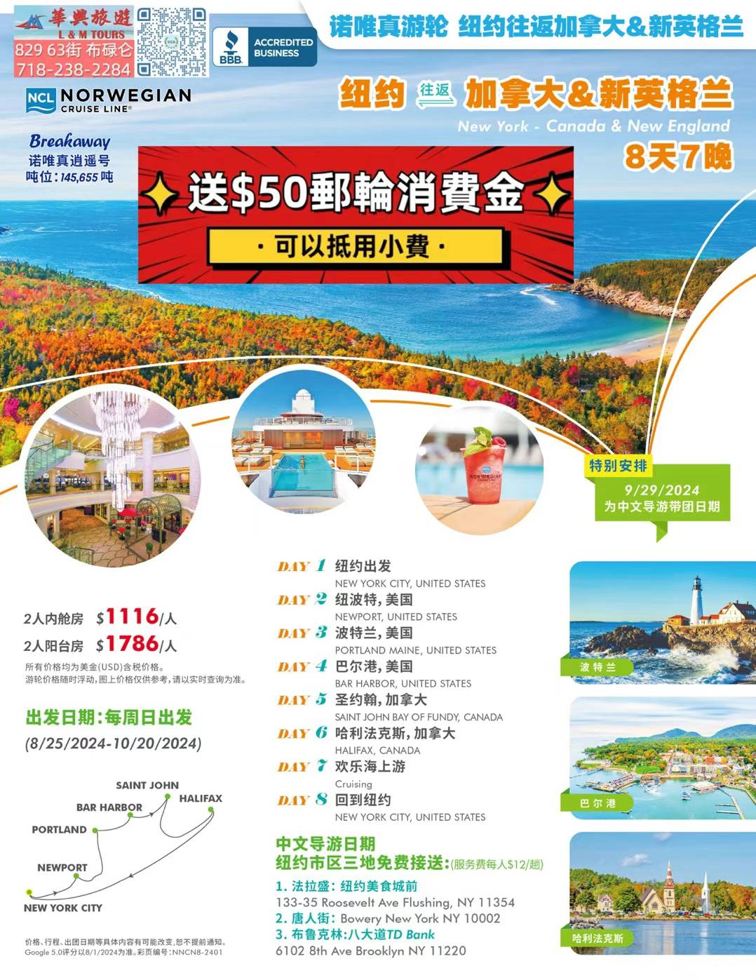 🔥NCL 纽约-加拿大&新英格兰 8天7晚 追逐枫叶之旅~