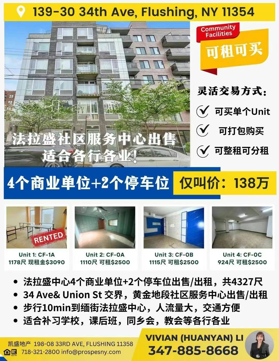 🔵法拉盛中心4个商业单位+2个停车位出售/出租,共4327尺