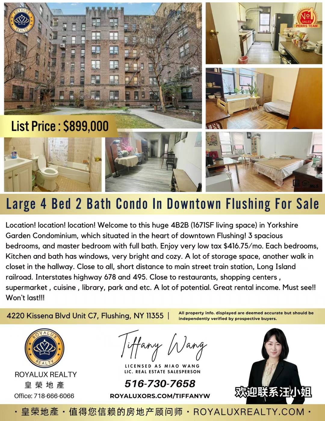 地点!地点!地点!欢迎来到这间超级宽敞的4卧2卫康斗,1671 sqft的超大生活空间,康斗位于法拉盛中心的Yorkshire Garden公寓内!康斗有三个宽敞的卧室,主卧室带完整浴室。您还可以将另一个卧室改造成一个带浴室的套房。低地税,每月仅需$416.75。每个卧室、厨房和浴室都有窗户,非常明亮舒适。储存空间很大,走廊里还有一个步入式衣橱。地段好,步行即可到达缅街的地铁站和长岛铁路,678号和495号州际公路。靠近餐馆、购物中心、超市、美食、图书馆、公园等。潜力巨大,租金收入可观,不要错过!欢迎同行转发合作及约看!🤝🏻