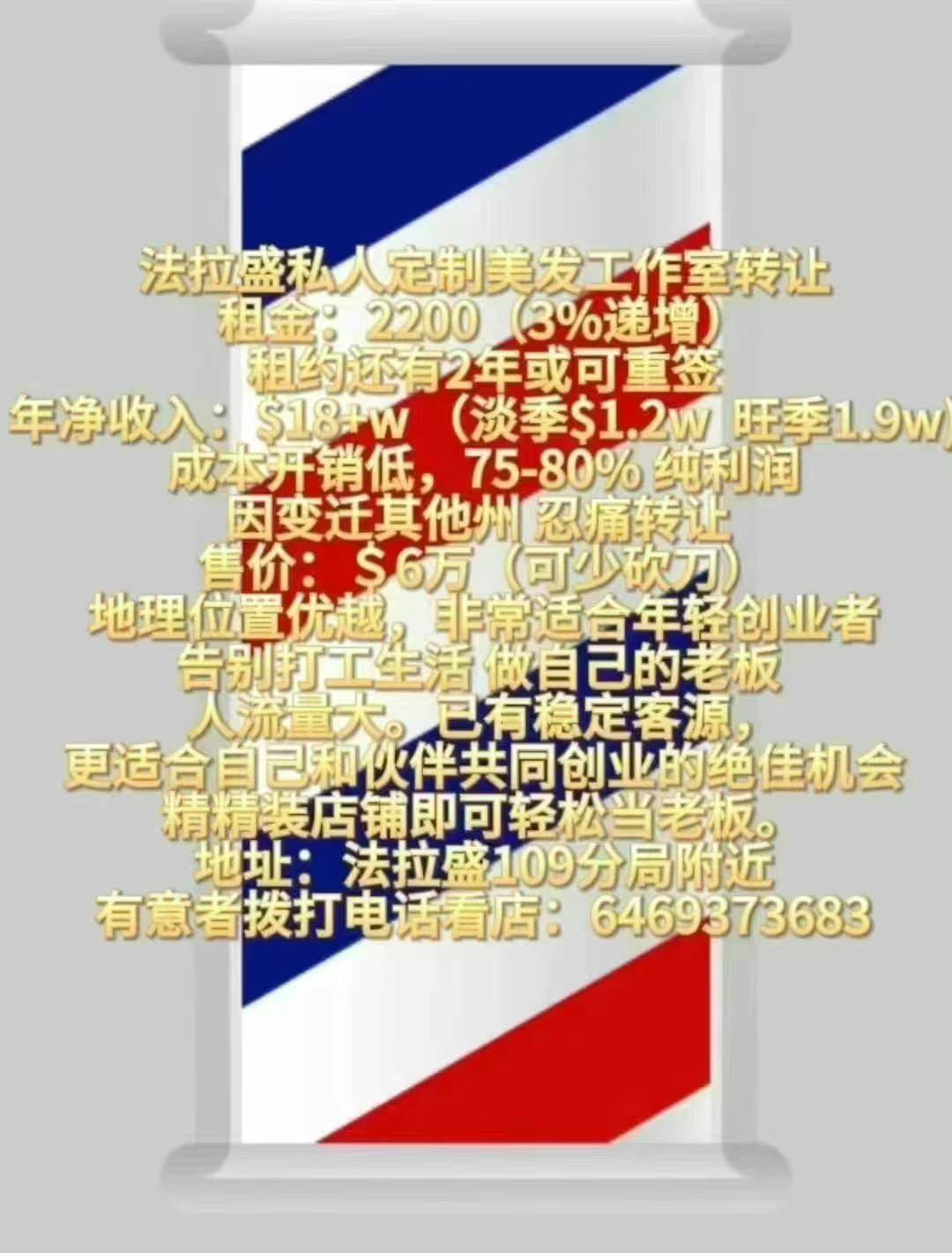 法拉盛私人定制美发工作室转让