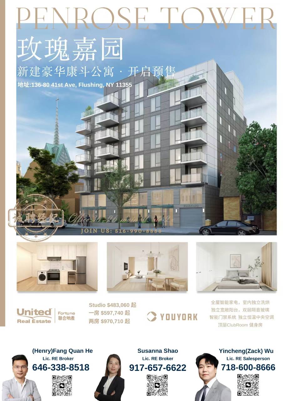 🔥法拉盛主街精品公寓Penrose Tower预售火热开启,华人投资安居首☝选