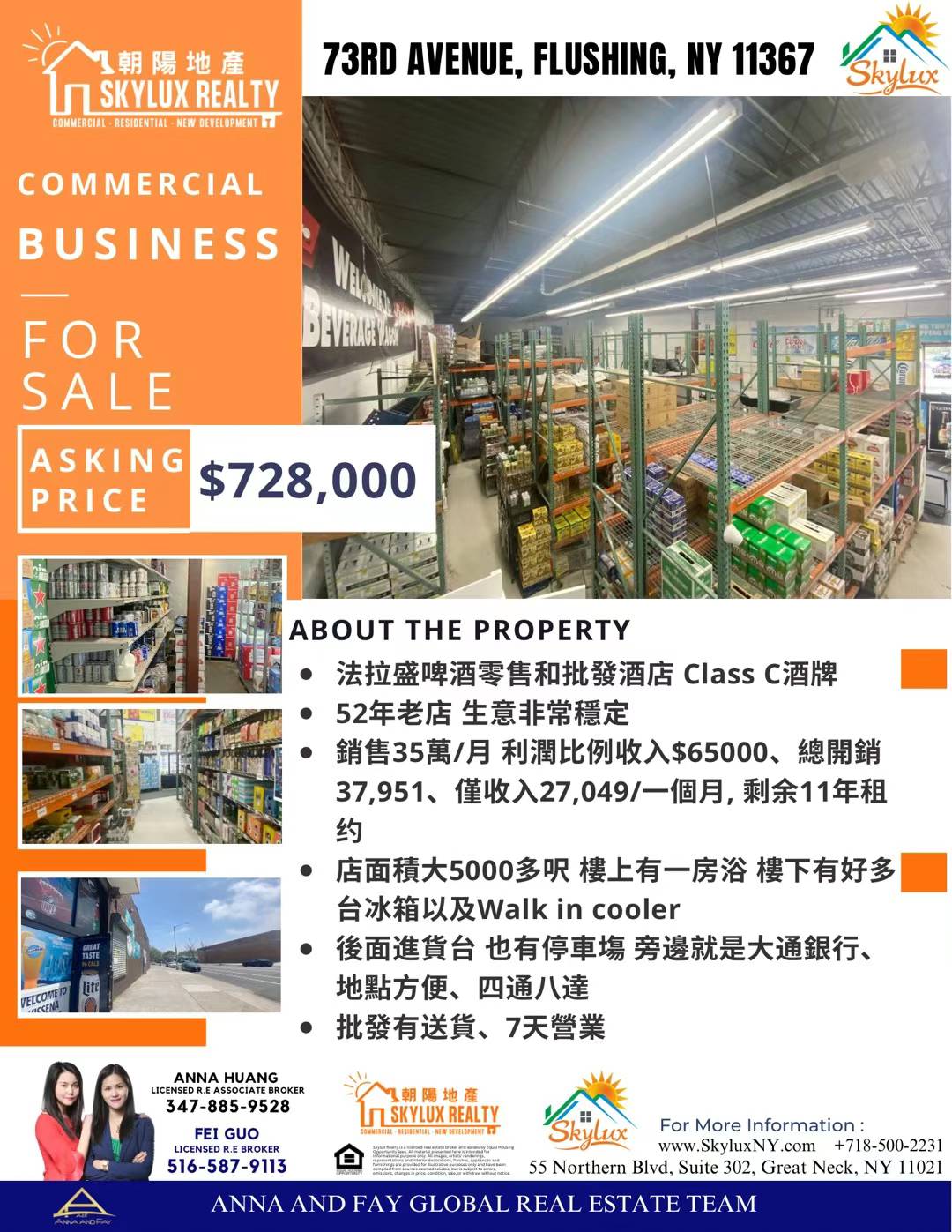 獨家代理 新上市 法拉盛零售和批發酒店 Class C酒牌 52年老店 生意非常穩定