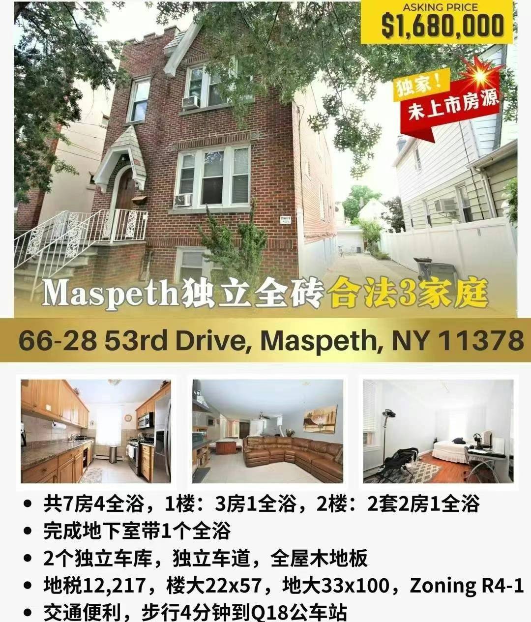 Maspeth NY皇后区麦斯佩斯房屋出售Maspeth NY新上市🌟【Maspeth独立全砖合法3家庭】出售🌟🌟Asking Price: $1,680,000 🌟