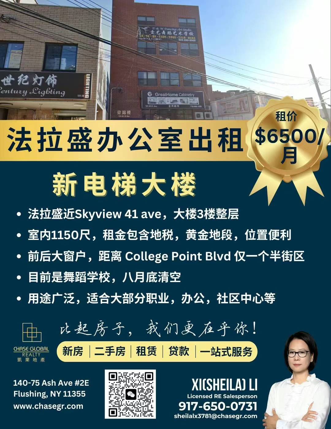 2)办公室出租:法拉盛中心131-34 41Ave近Skyview ,Homdepot ,新电梯大楼3楼整层出租$6500,前后大窗户,1150平方尺目前是舞蹈学校,因需扩充面积准备搬迁,8月底清空,适建筑,会计,正规按摩,补习班,联谊会等各行各业工作室MLS#3557865