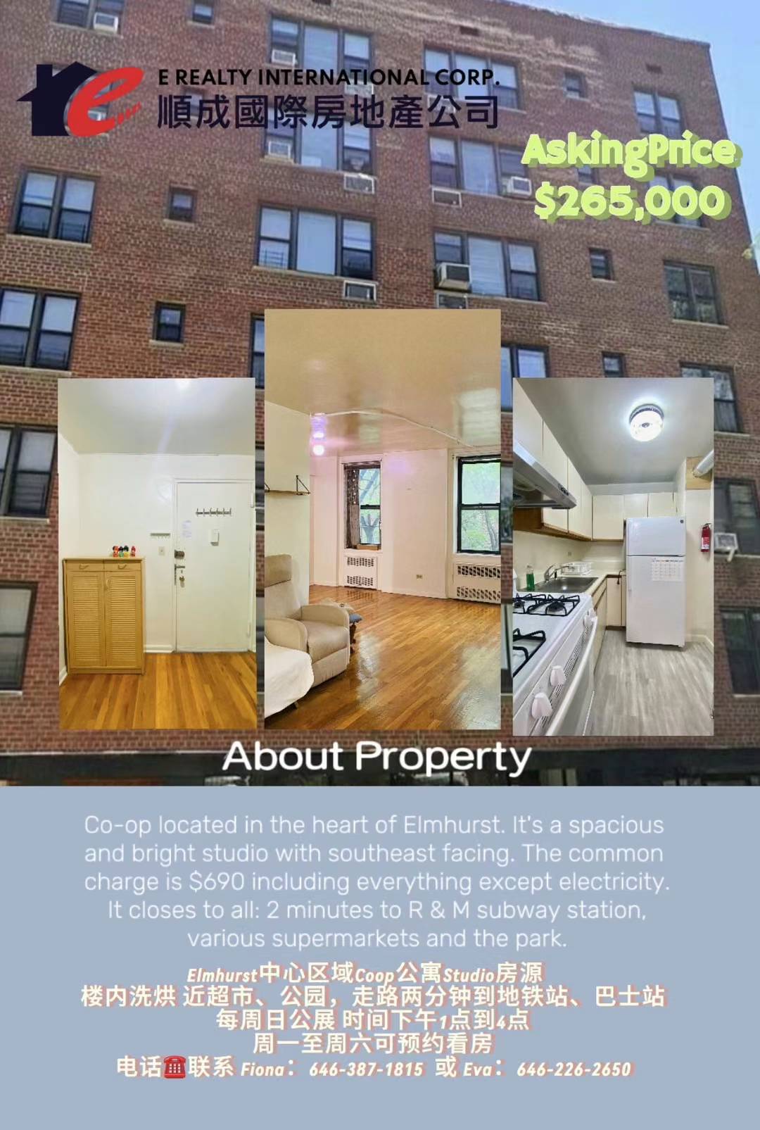 Elmhurst艾姆赫斯特房子出售Elmhurst NY新上市艾姆赫斯特筒仓💠Elmhurst中心地段Co-op 宽敞明亮筒仓Studio格局好(容易改2房),东南朝向. 管理费$690除电全包,楼内有洗衣房.💠艾姆赫斯特生活十分便利:2分钟到R & M地铁站,多家华人超市和公园⛲️自住或投资皆宜!💠售$26万5