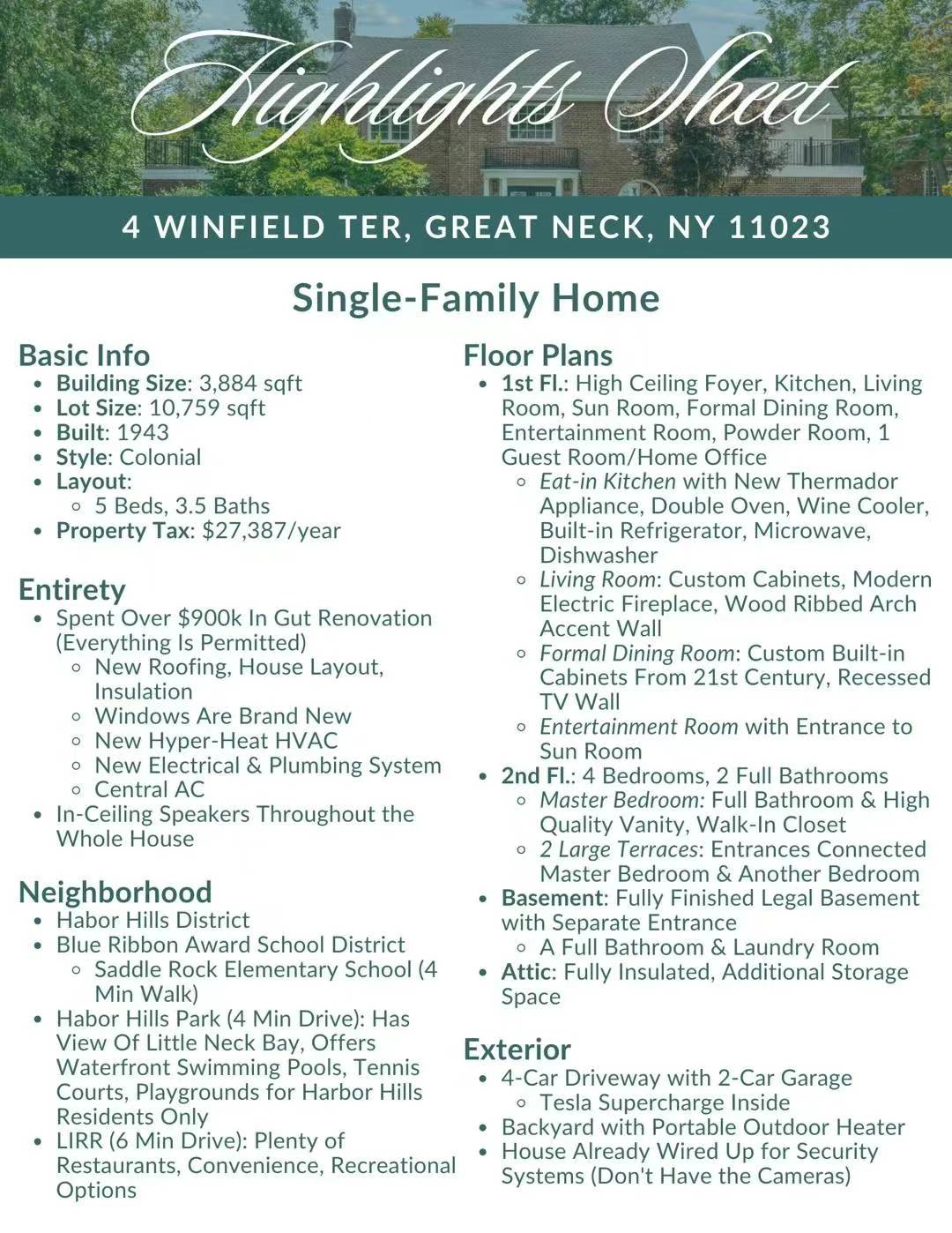 Great Neck 大颈房子出售 新上市Long Island长岛房子出售 Long Island NY新上市⛳️4 Winfield Terrace Great Neck NY 11023售价:$288万地税:$27,387 / 年室内面積:3884呎