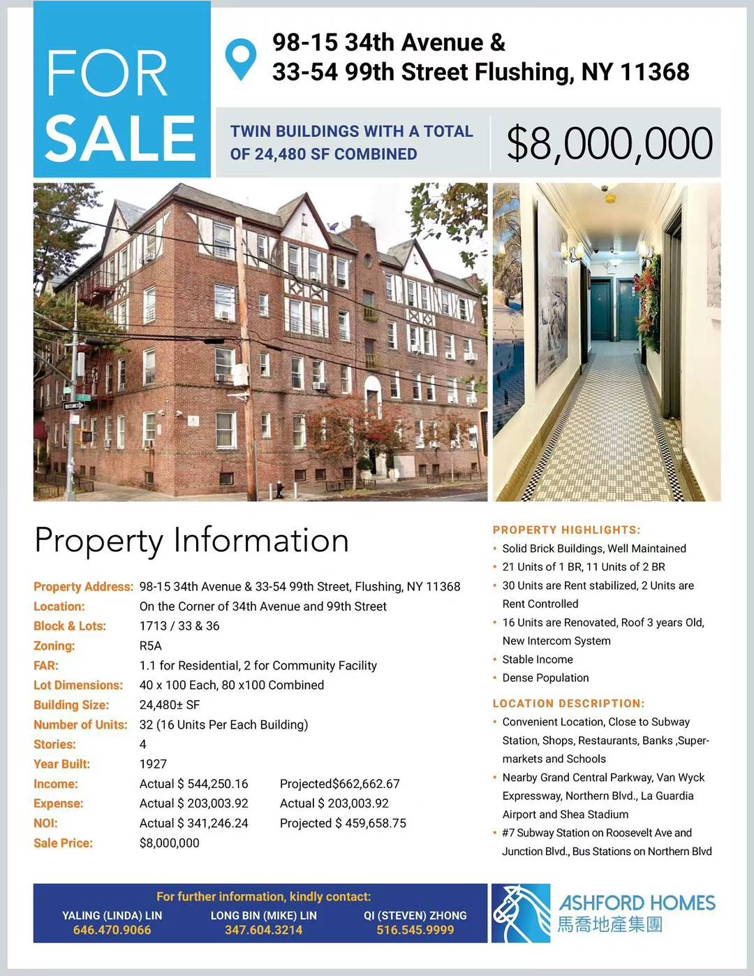 Corona可乐娜房子出售Corona NY新上市最新上市8百万Jackson Heights杰克逊高地房子出售 Jackson Heights新上市CORONA 中心近Jackson heights 两栋16家庭,总共3️⃣2️⃣家庭,一房两房混合大楼, 1️⃣栋building size 40x85 , 建筑面积11280尺,lot size 40x100,zoning R5A,tax 60310。2️⃣栋building size 40x90 , 建筑面积13140,lot size 40x100, zoning R5A , tax 45851, ⚠️5.5%回报率两栋售价$800万,约看需提供资金证明欢迎合作与转发 欢迎👏约看Steve鍾516-545-9999