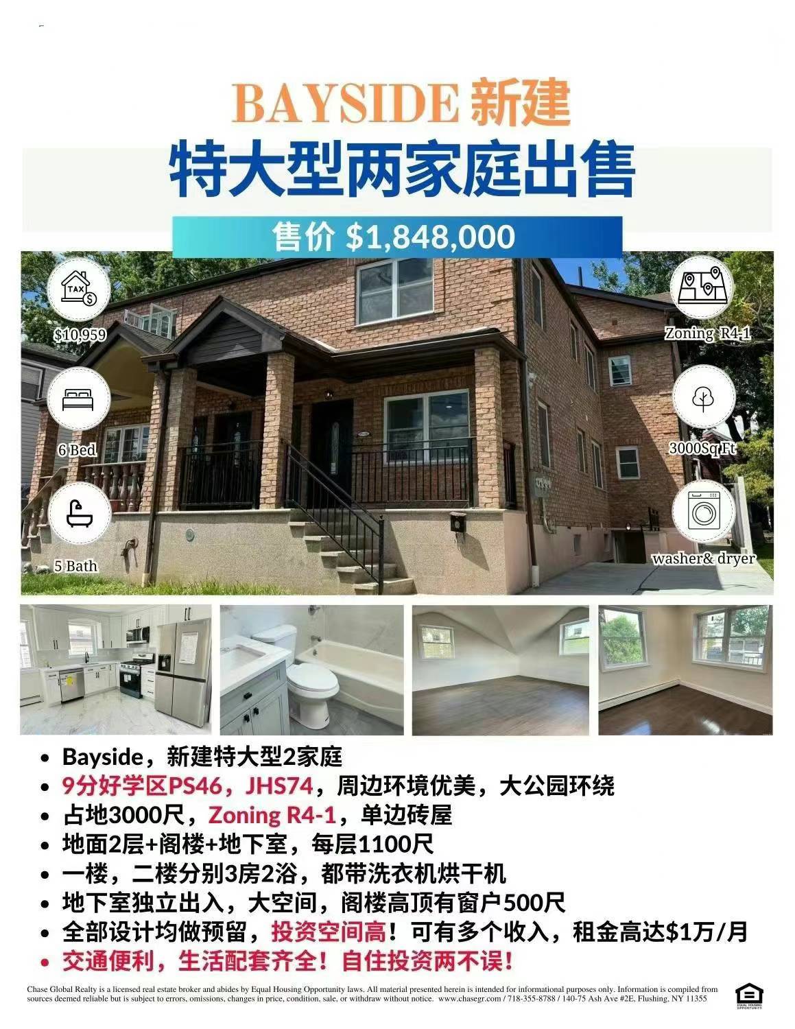 Bayside贝赛房子出售Bayside NY新上市 🔥貝賽 新建 特大型2家庭,9分好学区PS46, JHS74。周边环境优美,大公园环绕。