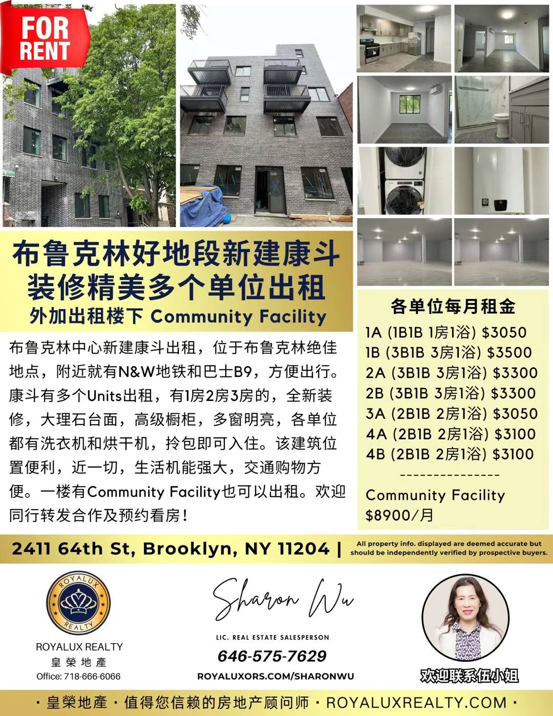 布鲁克林中心新建康斗出租,位于布鲁克林绝佳地点,附近就有N&W地铁和巴士B9,方便出行。康斗有多个Units出租,有1房2房3房的,全新装修,大理石台面,高级橱柜,多窗明亮,各单位都有洗衣机和烘干机,拎包即可入住。该建筑位置便利,近一切,生活机能强大,交通购物方便。一楼有Community Facility也可以出租。欢迎同行转发合作及预约看房!