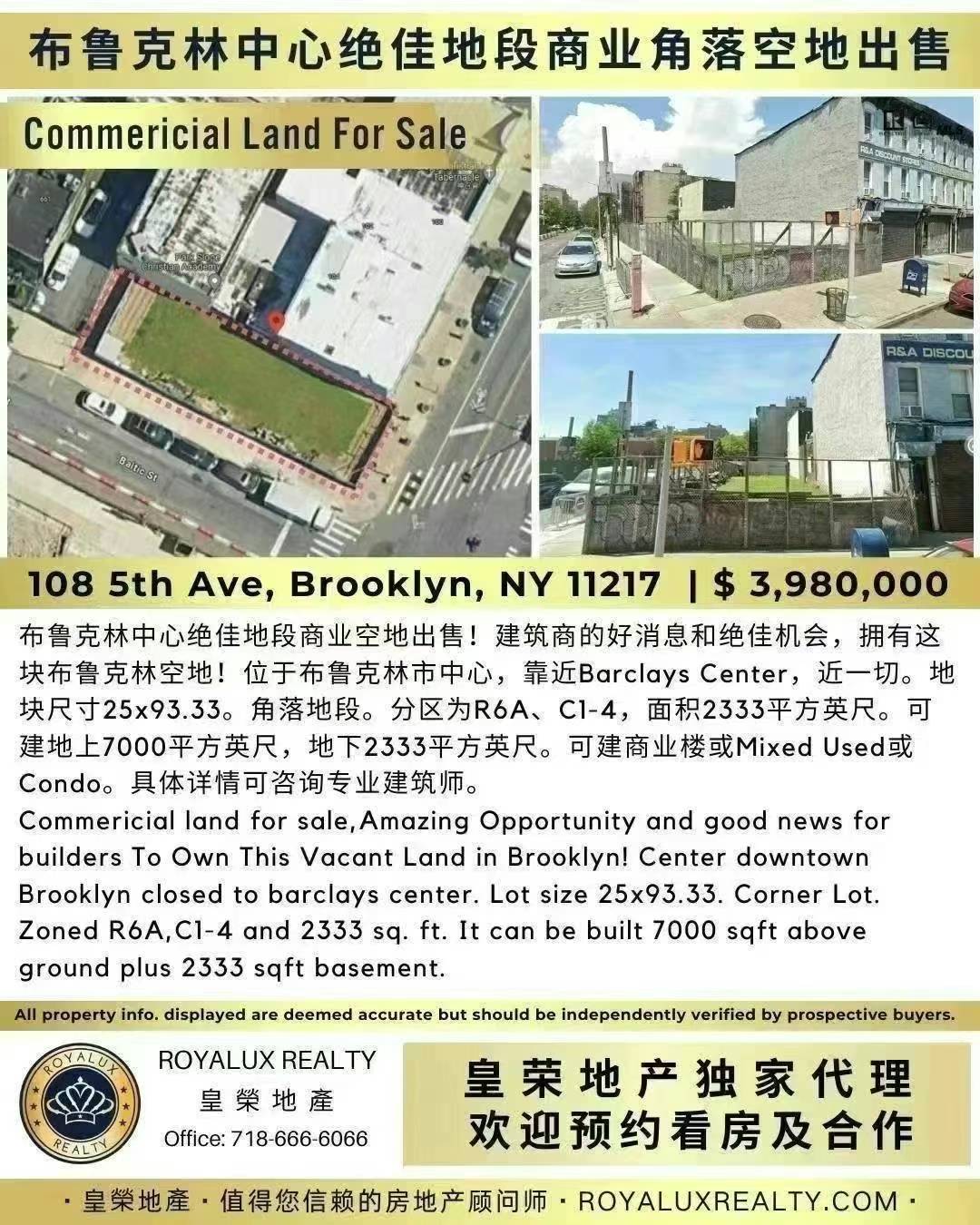 建筑商的好消息和绝佳机会,拥有这块布鲁克林建地!位于布鲁克林市中心,靠近Barclays Center,近一切。地块尺寸25x93.33。角落地段。分区为R6A、C1-4,面积2333平方英尺。可建地上7000平方英尺,地下2333平方英尺。可建商业楼或Mixed Used或Condo。具体详情可咨询专业建筑师。售价$3,900,000.
