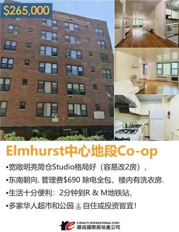 Elmhurst艾姆赫斯特房子出售Elmhurst NY新上市💠Elmhurst中心地段Co-op 宽敞明亮筒仓Studio格局好(容易改2房),东南朝向. 管理费$690除电全包,楼内有洗衣房.