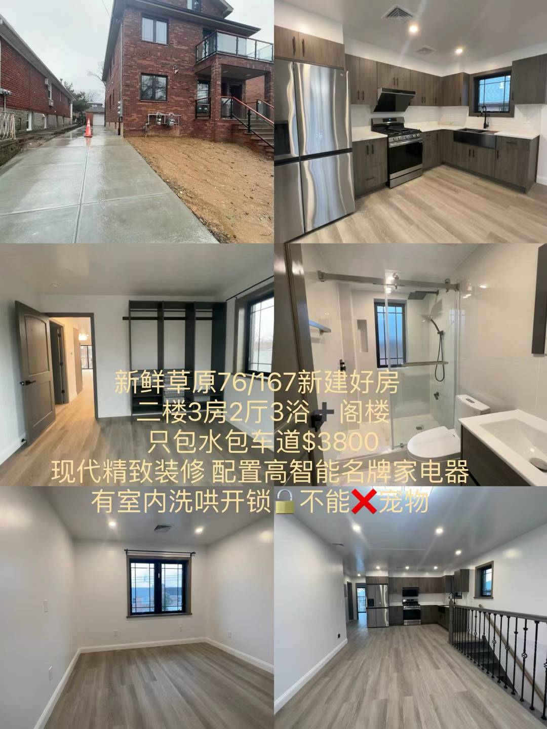 Fresh meadows新鲜草原房子出售 Fresh meadows NY 新上市 新鲜草原76/167 新建好房 二楼3房2厅3浴➕阁楼(有2个套房2个阳台) 只包水包车道$3800现代精致装修 开放式厨房 客厅有阳台 房间也有阳台 厨厕都有窗户 南北通透 有阁楼巨大空间 配置高智能名牌家电器 有室内洗哄机密码锁指摸开门 开锁🔓不能❌宠物 各国人民 查信用查报税。 欢迎合作 6463937424Melody